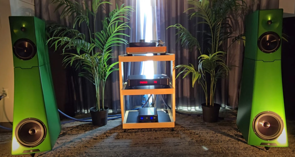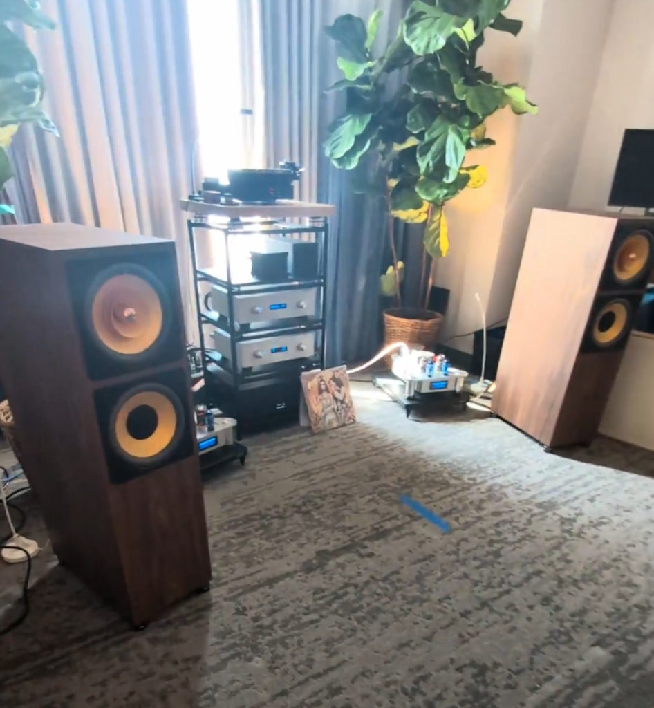 Another seemingly unassuming room. Stereo Haven’s appointment-only home shop brought a soulful, analog-rich setup built around the Well Tempered Lab Amadeus 254 GT turntable ($8,750) with a Dynavector DRT XV-1t cartridge ($9,750). Backed by a Jadis JP80 preamp, Sugden Sapphire FBA-800 power amp, and J.M. Reynaud Abscisse Jubilee speakers ($9,000/pr), the system delivered warmth, flow, and grip. With deep musicality and a relaxed yet punchy presentation. This system had plenty of texture, groove, and romantic charm.