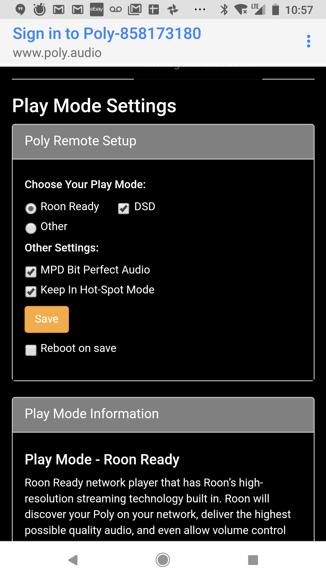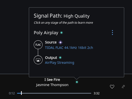Roon endpoint is off in this mode. This will enable both DLNA and Airplay. Roon could also play via Airplay to the Poly, albeit at degraded levels (Airplay only supports 44.1/16). I used BubbleUPnP on my Google Pixel to stream Tidal (MQA passthrough). Just set the Poly as the renderer. There are ways to actually access your NAS music files away from home but that's outside the scope of this article for now.