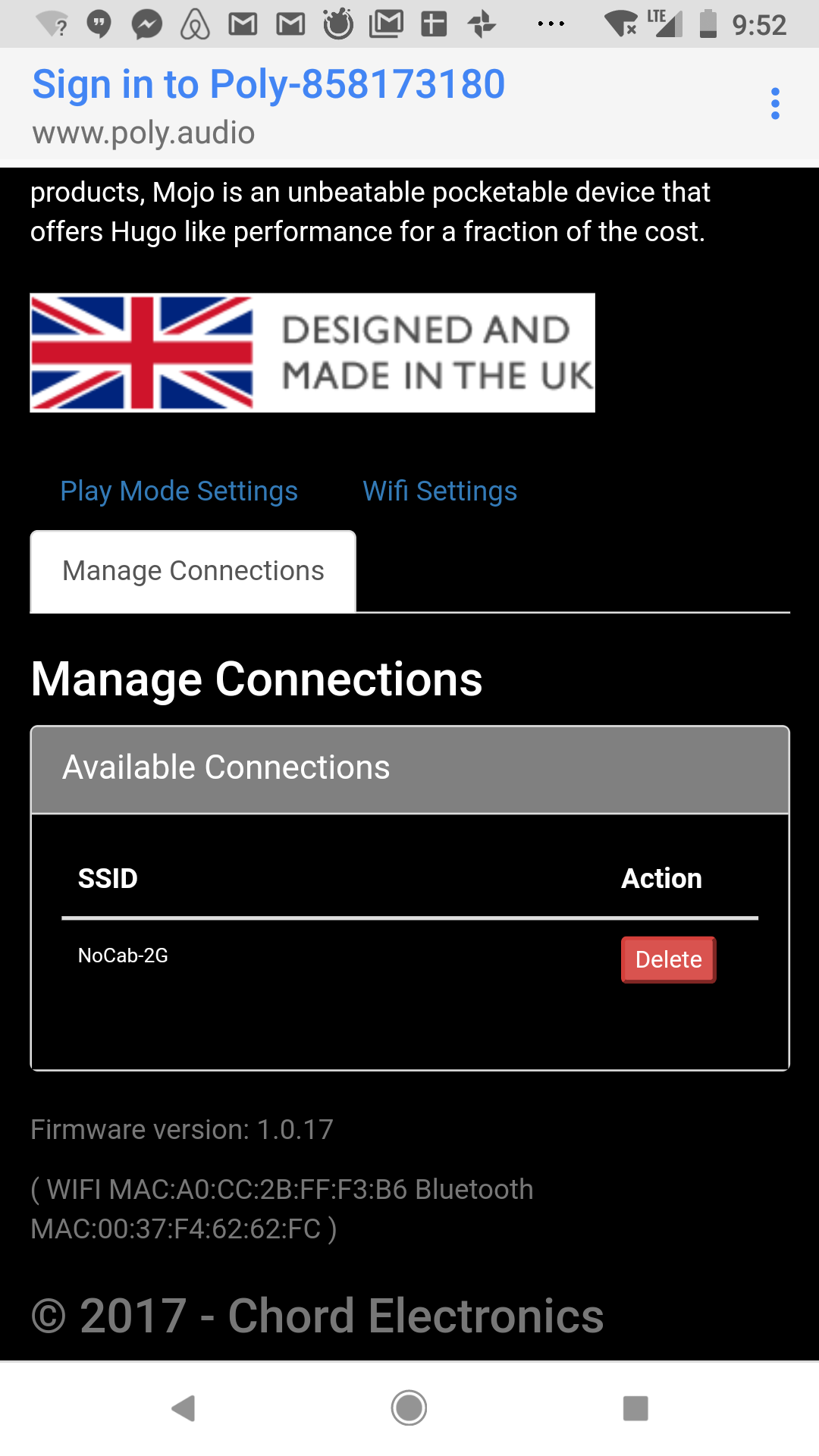 Charge your Poly before use! Preferably with 2 amps for a quicker charge (4 hours). Most computer USB ports only supply 0.5A and will take about 10 hours to charge fully. Most wall-plug chargers will do 2.1A. When charging the Mojo and Poly together, Mojo gets the juice first so it's important to use quicker chargers. FYI, The Mojo and Poly both get quite warm while charging. The reference IEM I'll be using for the Poly review is the Periodic Audio Be. It is an absolutely amazing match with the Chord Mojo. I typically don't read the manual but the one for the Poly is worth reading. The instruction manual will mention the GoFigure app which hasn't been released yet. This app will help make the connections easier in the future. Mobile hotspot is also disabled at the time of this review so we'll ignore that option. One thing to note about the config button: All it does is puts the Poly in Access Point mode, where you could log into it and configure it. It does not reset your settings. Other than deleting the stored WiFi connections, there is currently no way to factory reset the Poly. So if you're moving from your home network to an off-site office, you'll need to bring this metal pin with you to setup new WiFi environments. Chord recommends putting it on your keychain. A paperclip won't work ;)