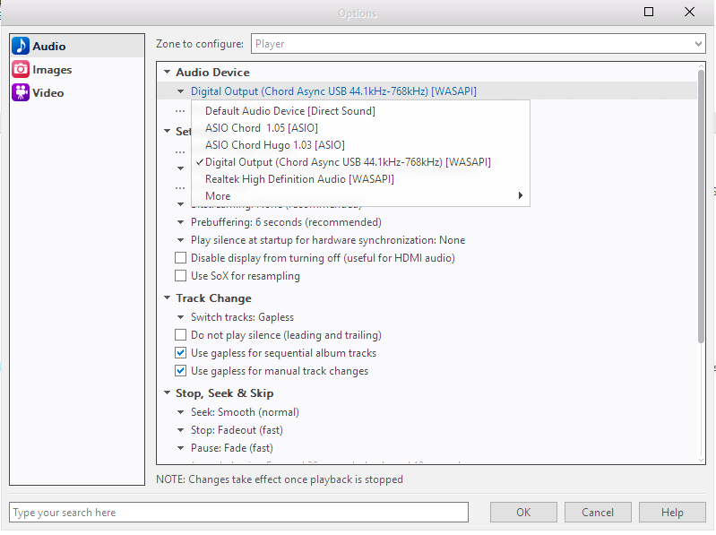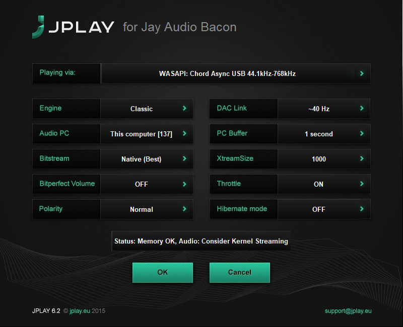- WASAPI, Engine: Classic, DAC Link: 40 Hz, PC Buffer: 1s, rest at default.