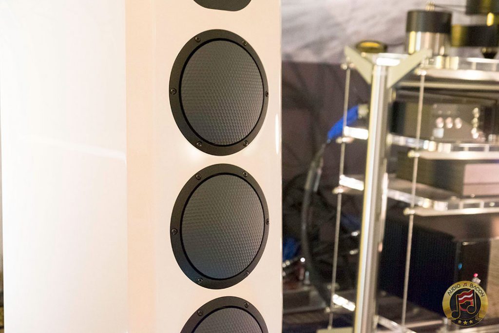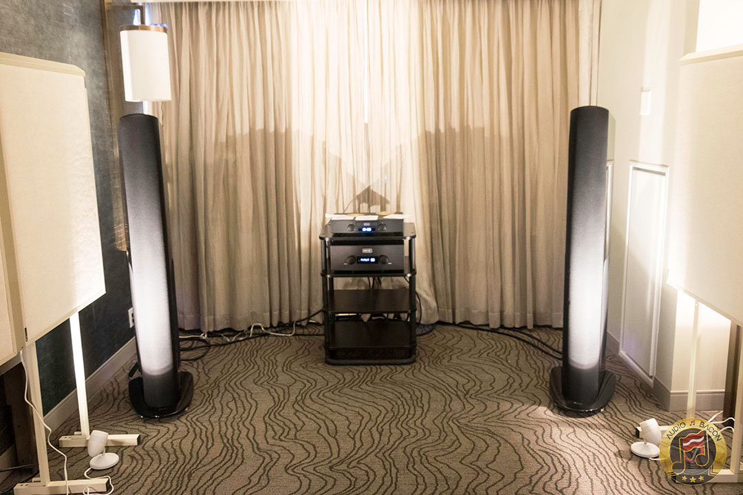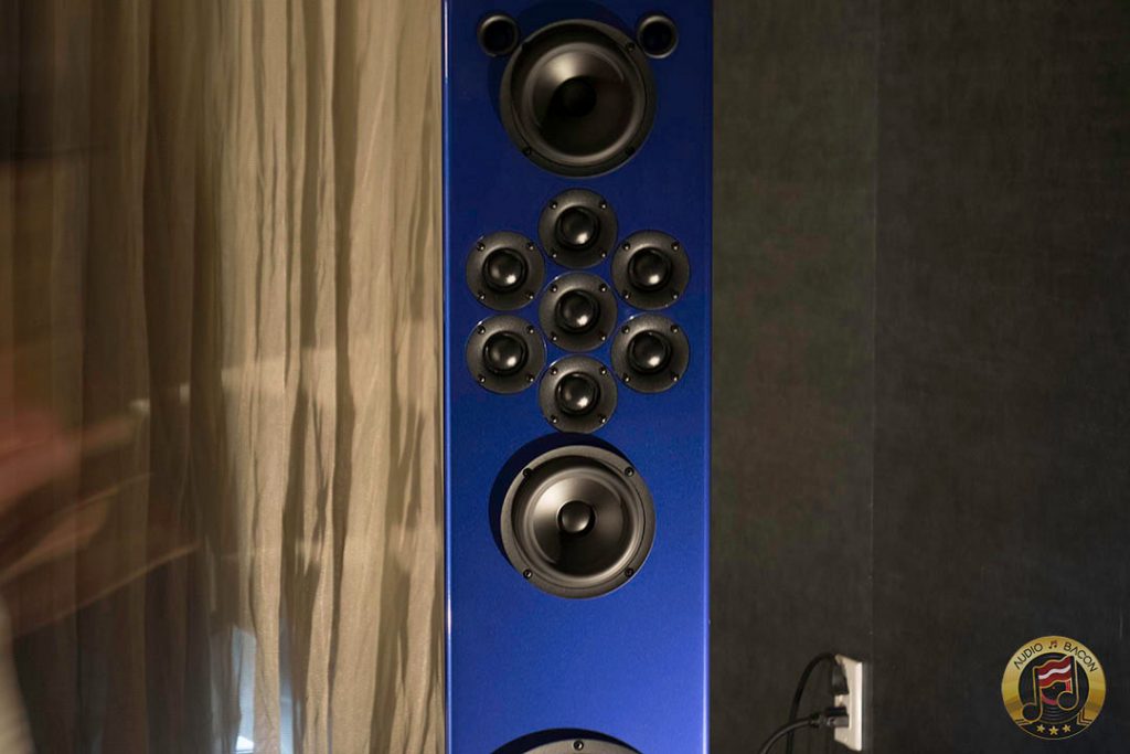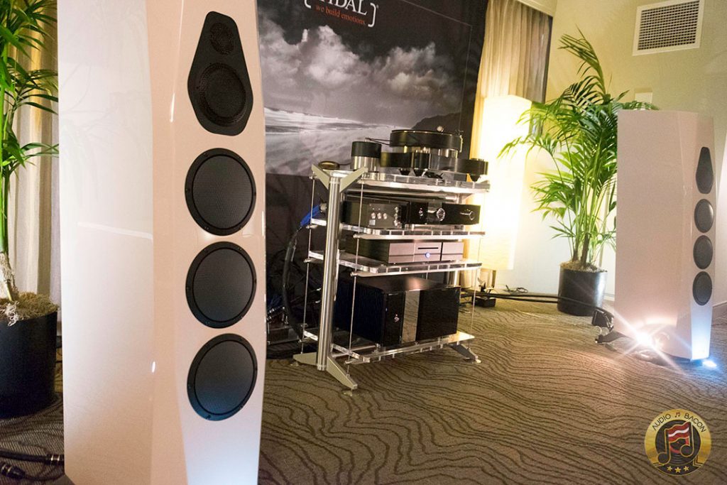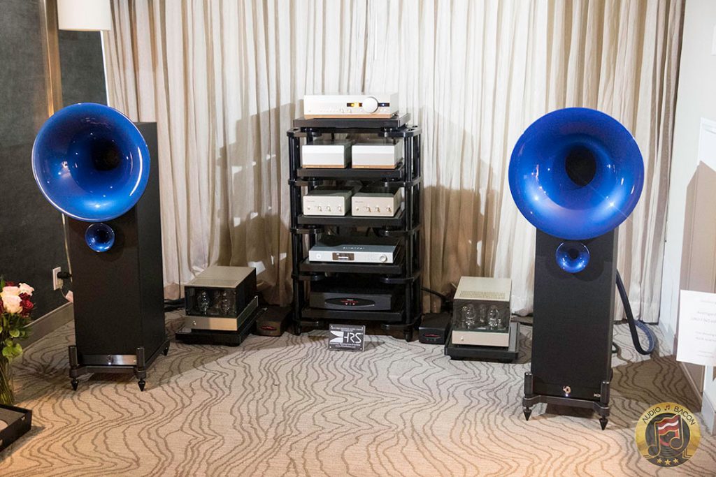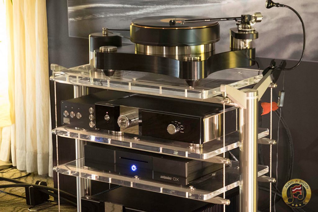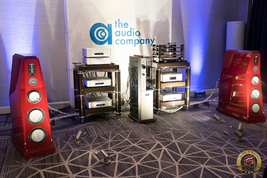 Von Schweikert Audio Ultra 9s ($200,000) in flamboyant red and VAC Statement 450i iQ integrated amplifier ($150,000). A sight to behold. Von Schweikert Audio V12XS Shockwave subwoofer ($11,500), Esoteric Grandioso P1 transport ($38,000), D1 monoblock DAC ($19,000 each), G-01 rubidium clock ($20,000), N-01 ($20,000), Critical Mass Olympus Luxury rack ($61,500), Kronos Pro turntable ($51,500), Airtight Opus 1 cartridge ($15,000). Revealing, fantastic layering and separation, with exuberance and air. Not a very warm sounding system but great for piecing out the many parts of the busiest and most involved of recordings.[/caption]