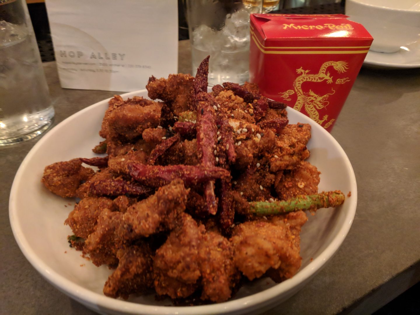 Hop Alley - La Zi Ji - Fried chicken, dried chillis, and Sichuan peppers. A crispy and numbing good time! We highly recommend bone marrow fried rice and steamed eggplant. Their spirits are also top-shelf.[/caption]