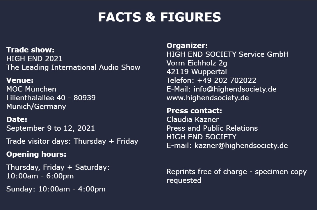The organizer of the event, the HIGH END SOCIETY Service GmbH, is pleased to announce that the HIGH END 2021 is now fully booked, even before the registration deadline at the end of March! After more than a year without events, this is sure to be music to the ears of exhibitors, trade visitors, consumers, media representatives and, of course, everyone involved in the success of the trade show during both the planning and implementation stages. The constant high demand for the sought-after exhibitor areas in the halls and atriums of the MOC Event Center in Munich clearly shows how keen the industry is to finally showcase its high-quality products to a live audience again after being starved of the opportunity for months due to the Covid-19 pandemic.